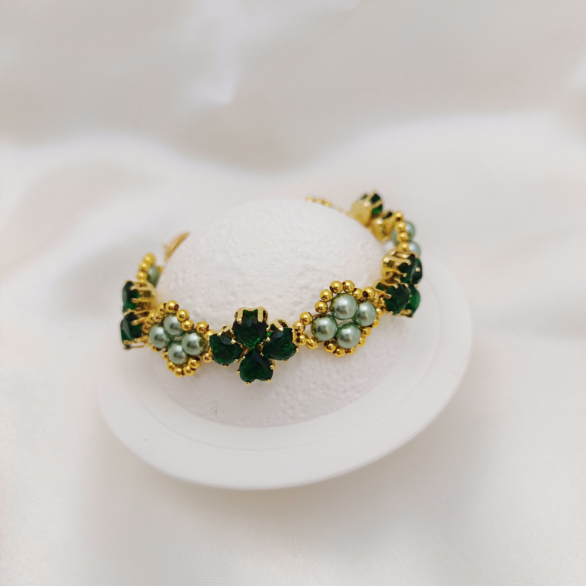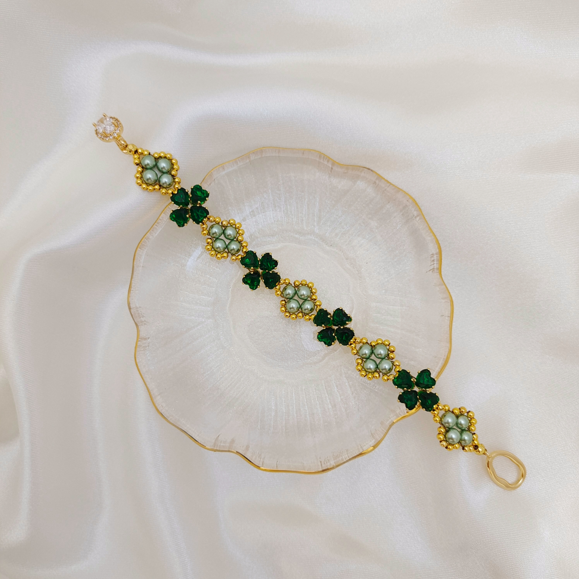 【No.70】 Clover Handmade Bracelet – Heart-Shaped CZ Charms, Pearls & Oval Clasp DIY Craft Jewelry Gift for Her