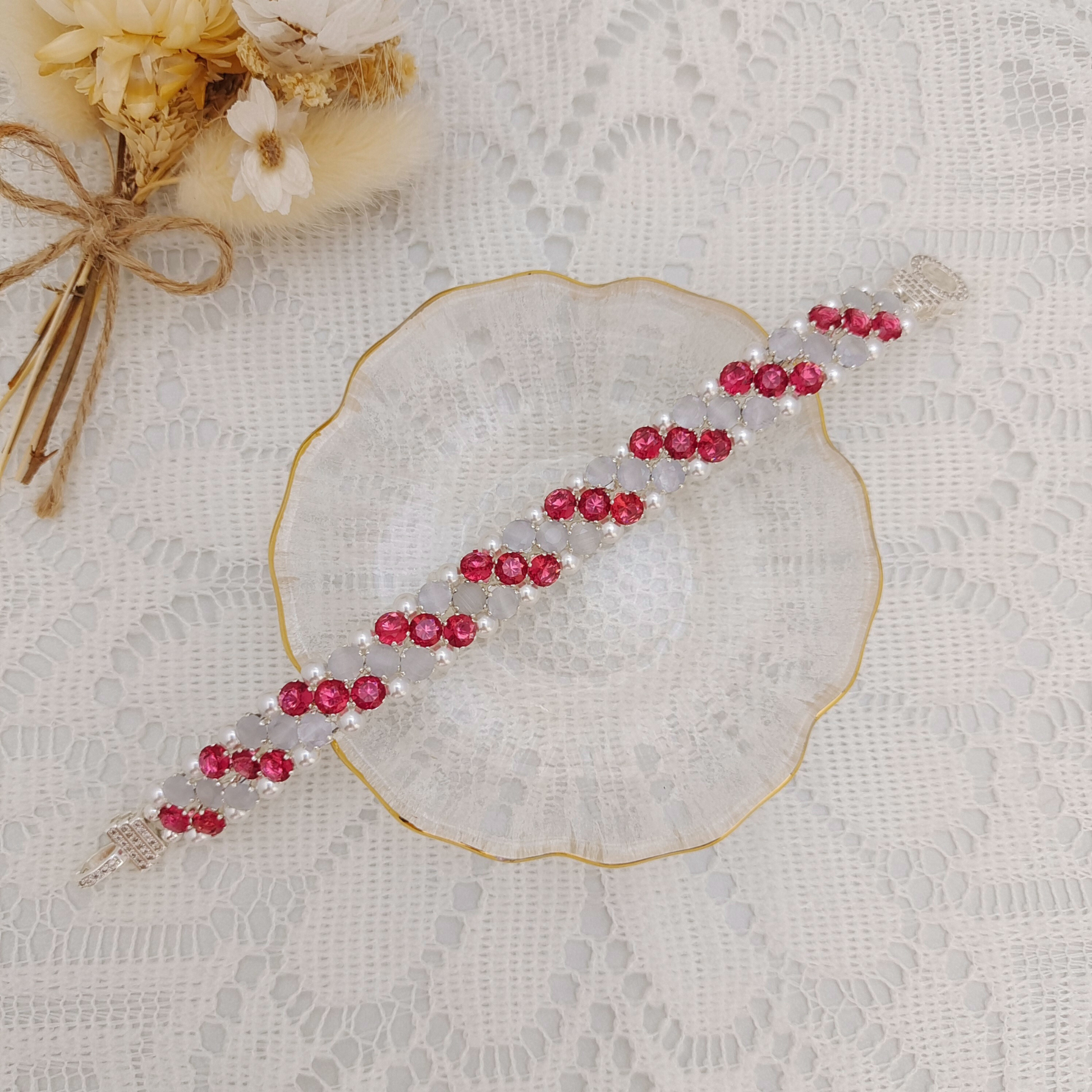【90】DIY Bracelet Kit – Carnation | Rose Red CZ + White Cat Eye + Pearls | Full Tutorial Included
