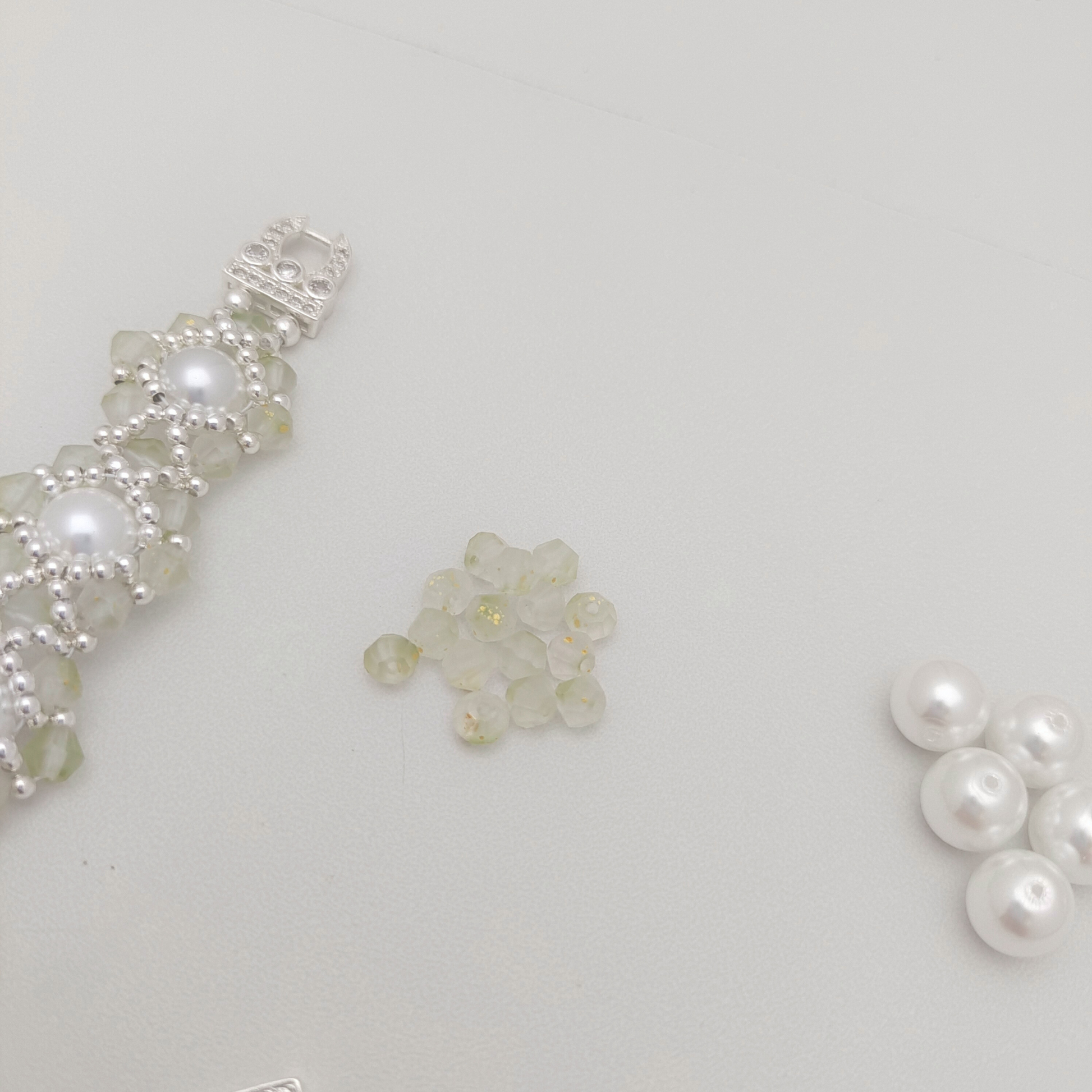 Bright, fresh, and full of texture — the “Summer Succulent” bracelet DIY kit captures the spirit of a lush garden in full bloom. Featuring 8mm pearls, vibrant 4mm diamond-shaped beads, and shimmering 2mm silver seed beads, this layered design brings out playful dimension with a soft, earthy color palette.