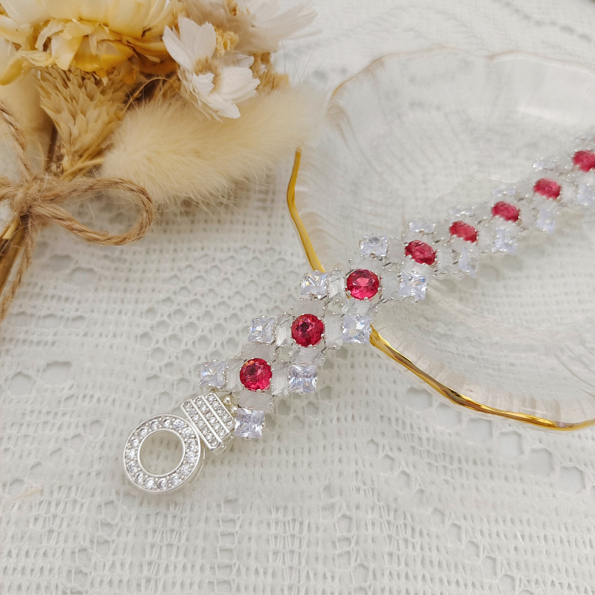 The “Lily” handmade bracelet is a dazzling statement piece combining three brilliant cuts of cubic zirconia — 2.5×5mm rectangular stones, 4×4mm square claw-set stones, and 5mm round CZs. Finished with a premium O-shaped clasp encrusted with micro pavé stones, this bracelet blends elegance and sparkle for any special occasion.