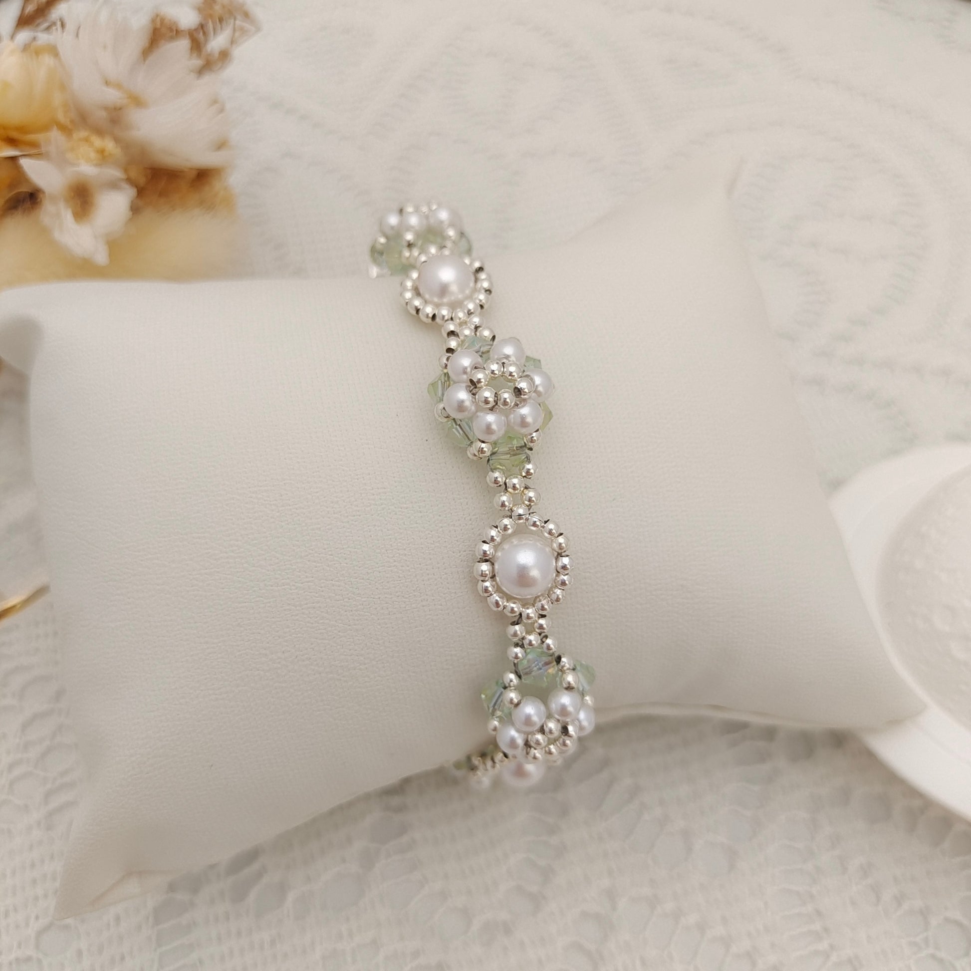 【No.105】Handmade Bracelet – Mini Sunflower | Pearls, Diamond Beads & Clover Clasp