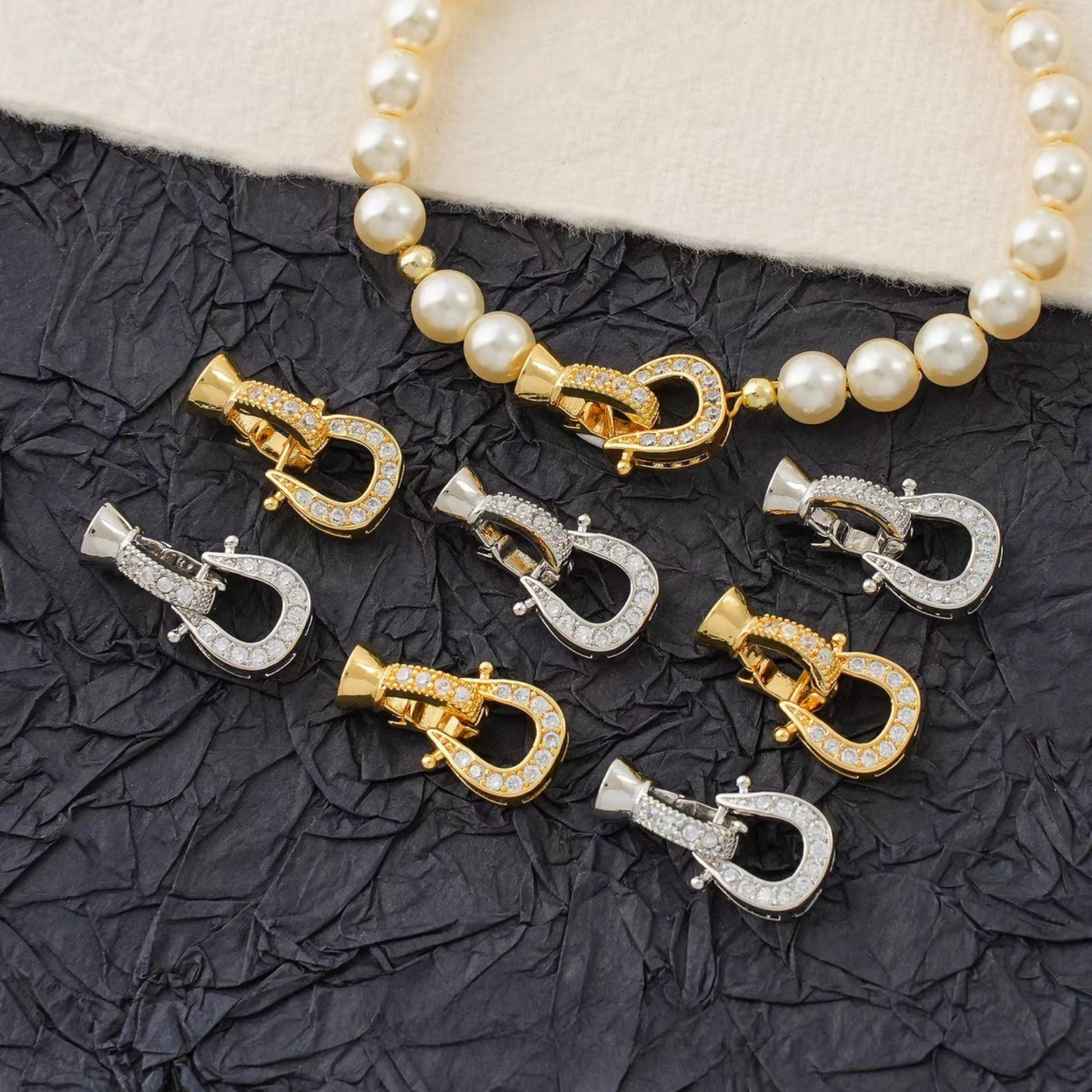 Elevate your handmade jewelry with this elegant horseshoe-shaped clasp connector, beautifully adorned with shimmering micro-pavé rhinestones. Its sleek curve and dazzling surface make it ideal for DIY bracelets, necklaces, or focal designs.