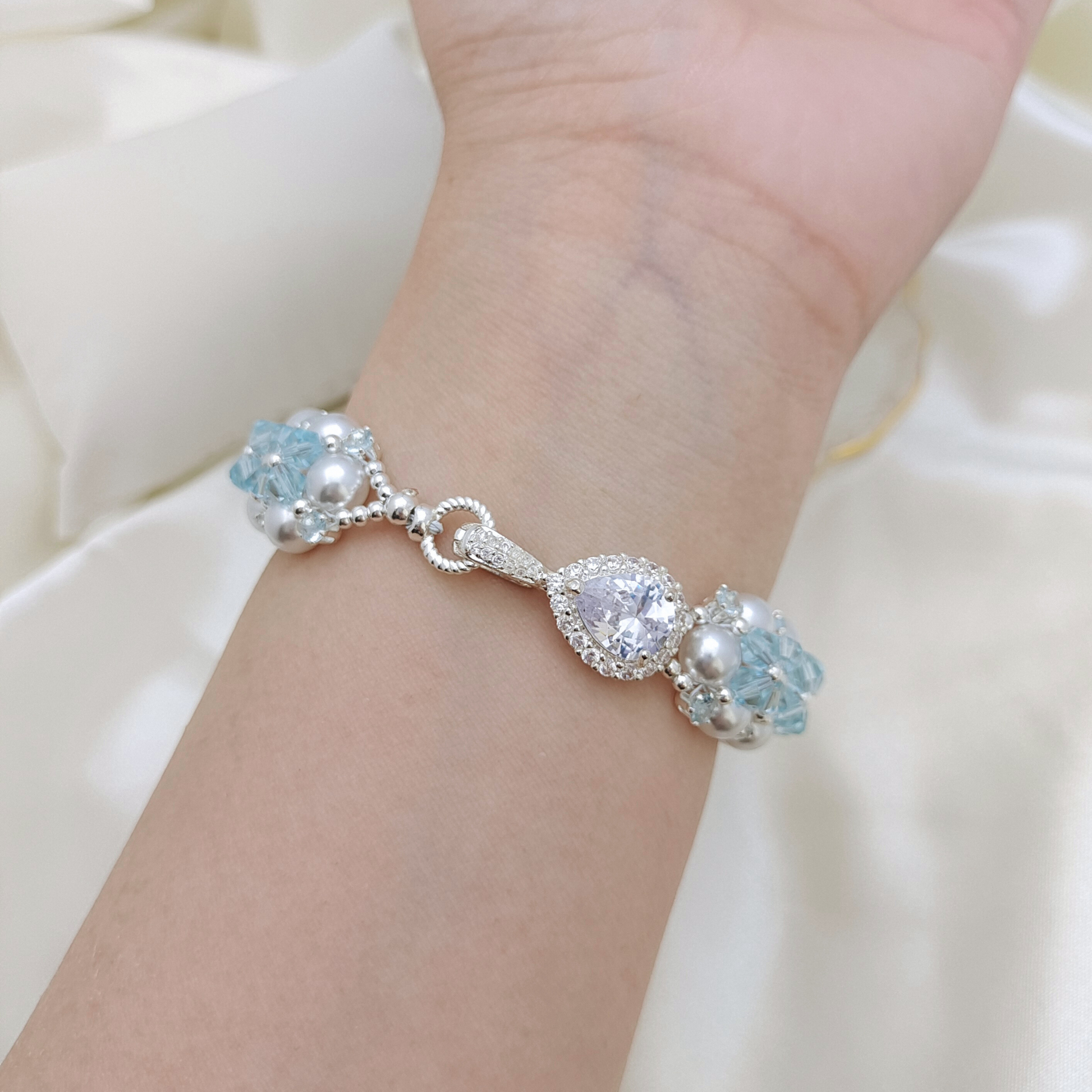 【No.79】 Tear of Mermaid Handmade Bracelet – 6mm Pearls, Crystals, CZ, with Teardrop Clasp DIY Craft Jewelry Gift for Her